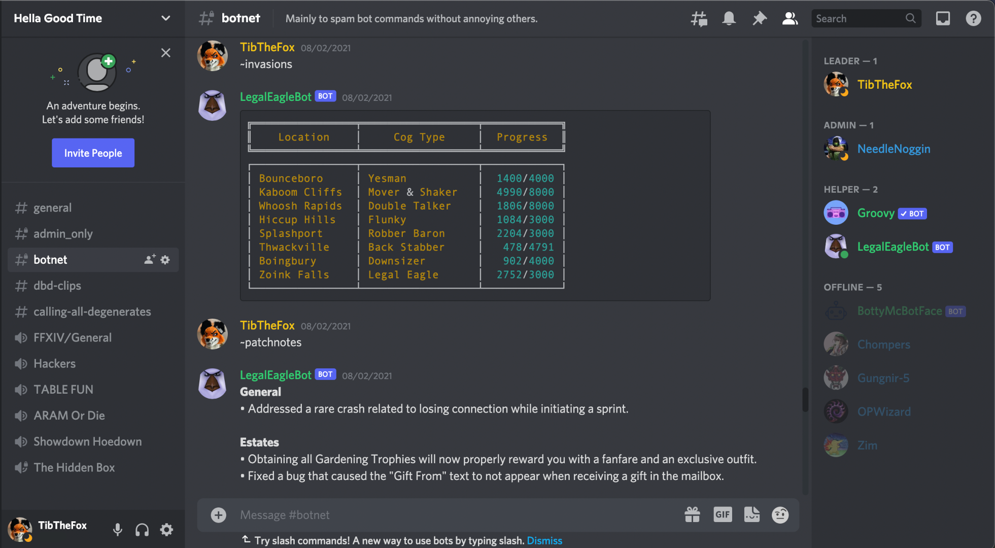 Enhance gameplay by using commands in Discord for checking Cog Invasions or reading the newest Patchnotes for the game "Toon Town Rewritten". More functionality to be added as ToonTownRewrittens API adds new features. Developed using Discord's API, ToonTownRewritten's API, and node.js.